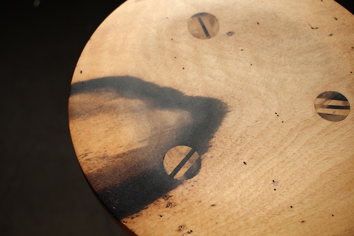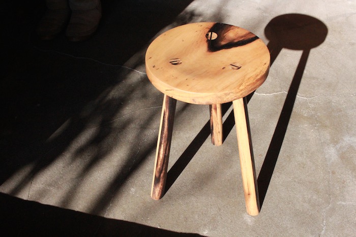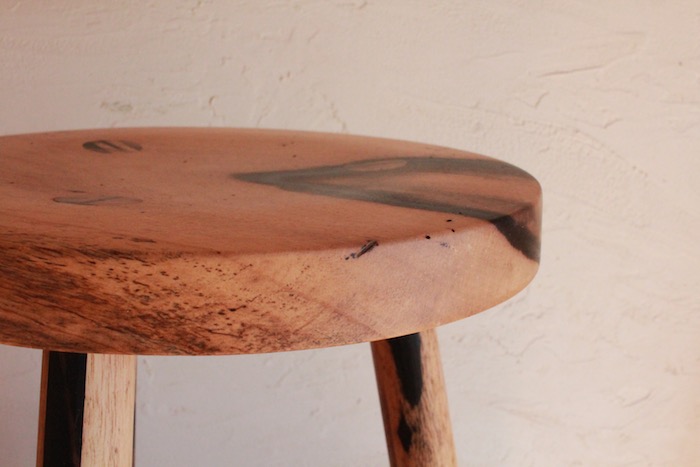 サイズ:W280/D280/H405(mm) 素材:黒柿 脚を留めるための楔(くさび)がアクセントになっていて、3本の脚がかわいいスツール。持ち運びもしやすく、気軽に腰掛けていただけます。その時々の在庫により樹種は様々。座面の厚みもその時々で違います。楔(くさび)の部分がヤギの目のよう。