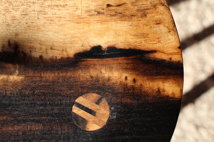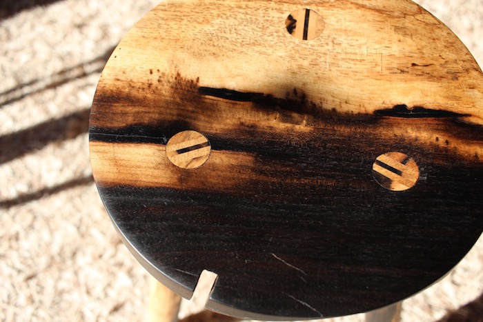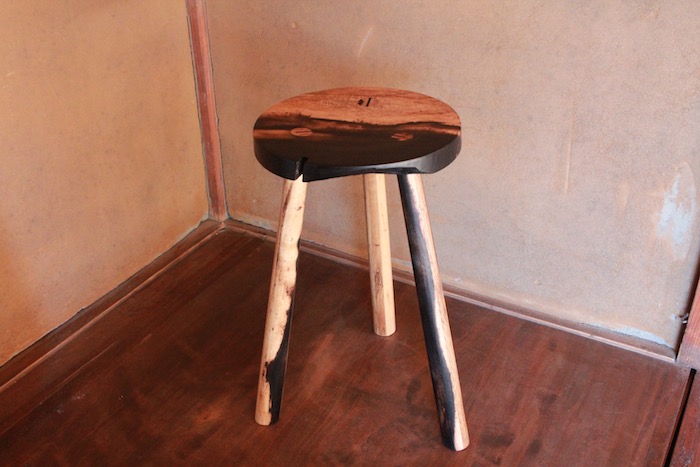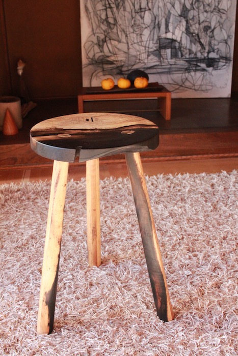 サイズ:W290/D290/H410(mm) 素材:黒柿 脚を留めるための楔(くさび)がアクセントになっていて、3本の脚がかわいいスツール。持ち運びもしやすく、気軽に腰掛けていただけます。その時々の在庫により樹種は様々。座面の厚みもその時々で違います。 貴重な黒柿を大胆に使用した一脚。